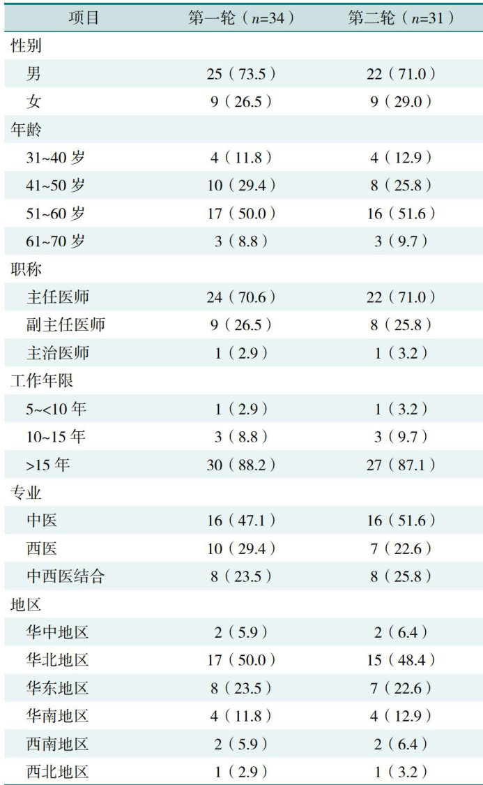 【摘要】背景痔病是肛肠科最常见的疾病,《痔中西医结合诊疗指南(2025版)》对规范痔的中西医结合诊疗意义重大。目的详细阐述筛选《痔中西医结合诊疗指南(2025版)》核心临床问题与结局指标的过程。方法通过文献分析、专家访谈及临床调研形成初稿问题清单,采用德尔菲法开展两轮专家咨询。运用SPSS 26.0和Excel 2021进行数据分析,计算积极系数、均值、满分率、变异系数及Cronbach's α 系数,纳入标准:临床问题均分 ?3 分、结局指标均分 ?7 分、满分率 ?50% 、变异系数 <30% 。质量控制标准:专家积极系数 ?75% 、肯德尔和谐系数 >0.7 、Cronbach's α 系数 ?0.7 作为德尔菲法问卷质量控制标准。结果经过初步调研,拟定了27个临床问题(9个基础问题和18个PICO化临床问题)与9个结局指标。对34位相关领域专家进行两轮德尔菲法调查后,形成28个临床问题(9个基础问题和19个PICO化临床问题)与9个关键结局指标。两轮问卷专家的积极系数分别为 85.3% 和 97.0% 肯德尔和谐系数分别为0.837、0.826,临床问题和结局指标各条目的Cronbach's α 系数分别为0.929、0.866和0.923、0.803,表明专家对本研究的关注度高,分歧小,协调程度高,问卷信度良好,结果可靠性高。经研究组内专家讨论后,最终确定28个临床问题(9个基础问题和19个PICO化临床问题)纳入指南。临床问题涵盖痔病中医特征、术前评估、中西医诊疗方式、围术期管理等。结论基于多维度调研与德尔菲法建立的临床问题及结局指标体系具有完整的科学框架,可为相关中医药循证指南的制定提供参考。